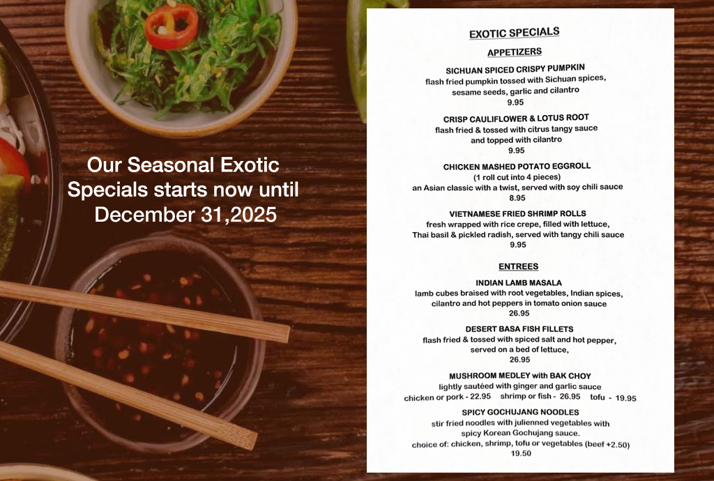 We offer"Exotic Specials Menu to each season tointroduce newer dishes when we serve the seasonalvegetables available. We are known to serve Soft ShelCrab with 5 different choice of preparation, during theseason and our Summer Menu featuring Summer Rollswhich everybody craves.No doubt, our Specials is limitecto the season, customers hate to see it end but cannotwait to see what is in our new Specials feature. We like tokeep things interesting throughout the year. As thefestivity goes,we serve a 5 courses,g items, a completeDinner Menu during the Chinese New Year festive seasonWe have been serving our customers from Montclair toChatham for 25 years and we would like to continue formany more years to come.