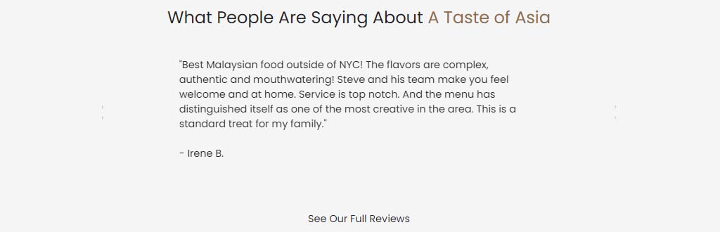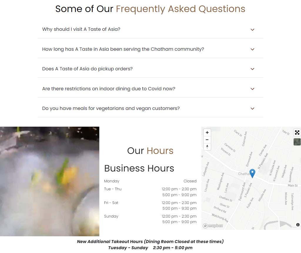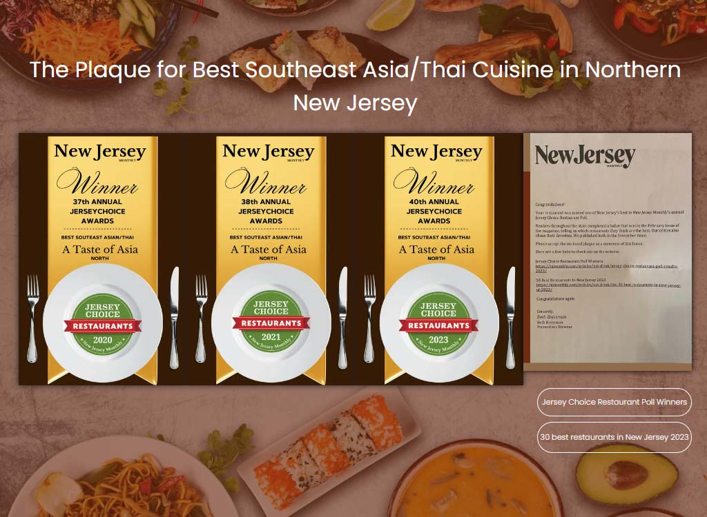 We established A Taste of Asia in Montclair, NJ when westarted the cuisine in the State of New Jersey. The yearwas 1995 which we were written up in several majorpublications such as The New York Times, The Star LedgerZagat Survey and many more. We branched out toChatham in the year 2000 and running both therestaurants was quite exhausting. By the end of 2003, weclosed the Montclair store when the lease expired andkept the larger location in Chatham. We cater to dietarypreference customers which we support them by havingseveral different category in menus, such as VegetarianMenu, Gluten & Wheat Free Menu & Real Authentic SpicyMenu.